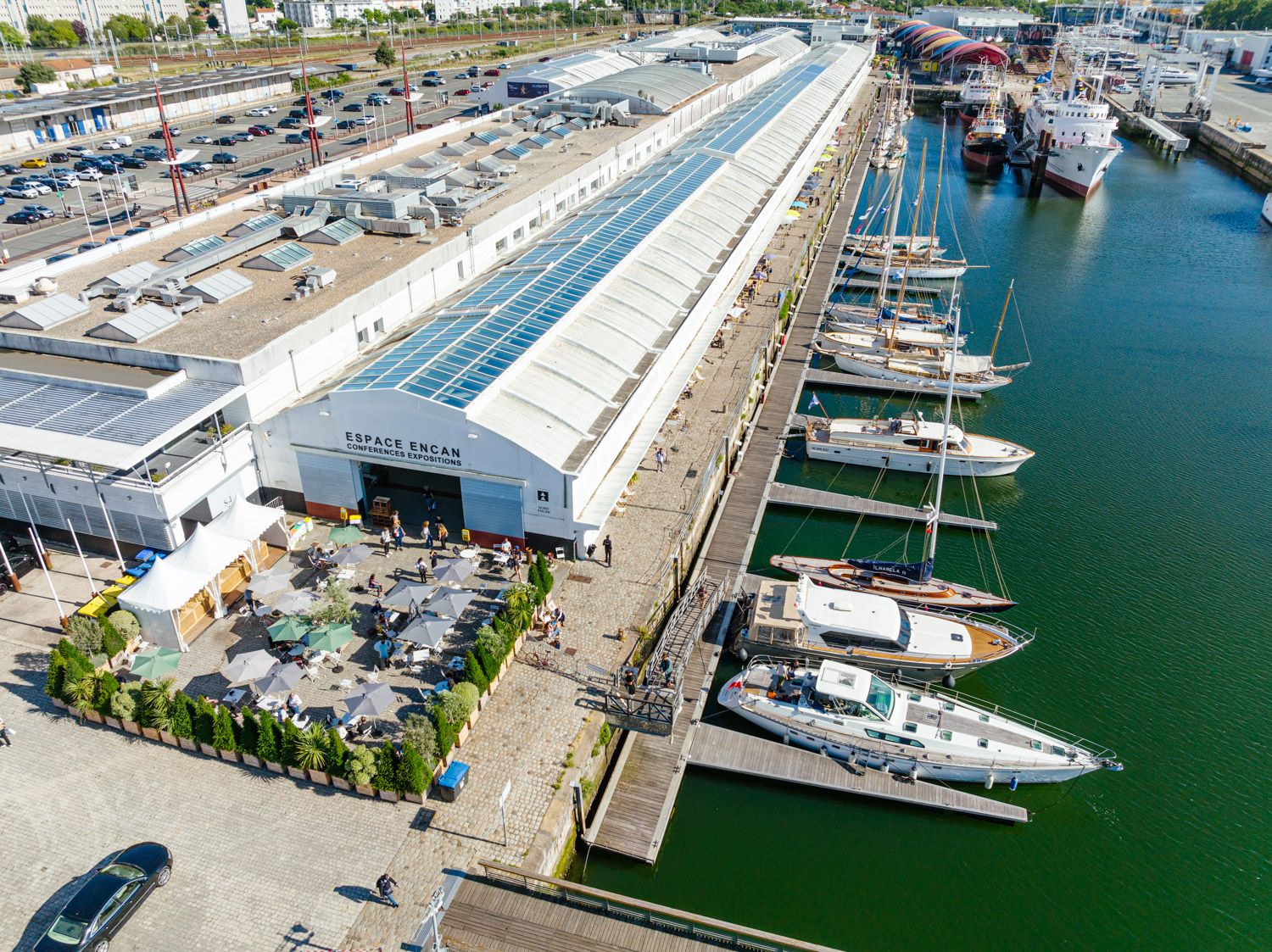 - une grande halle de 3000 m2, une Petite halle de 1300m², ouvertes sur le bassin, sous verrière et sans aucun poteau, permettant aux manifestations accueillies de créer des scénographies hors du commun